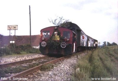 Freisinger Studenten organisierten im Herbst 1969 eine Sonderfahrt nach Attenkirchen. Die Freisinger Köf zieht ein Umbauwagenpärchen und einen gedeckten Güterwagen den Berg hinauf. Der Regelverkehr war bereits eingestellt. Dies dürfte einer der letzten Züge vor dem Abbruch der Strecke gewesen sein. Wir haben bis jetzt kein Foto des Wartehäuschens auftreiben können. Ein Flitzinger Landwirt kaufte den Holzbau nach der Einstellung des Personenverkehrs, baute ihn ab und stellte ihn in abgewandelter Form im Hof als Scheune wieder auf. Mittlerweile existiert leider nichts mehr. Nach dem Abbruch der Strecke Zolling - Au 1970/71 reichte das Gleis noch über den Bahnhof Unterzolling hinaus und fast bis Flitzing. Die Gemeinde Zolling plante, zwischen dem Bahngleis und der B301 ein Gewerbegebiet anzusiedeln. Eine Münchner Brauerei war im Gespräch. Doch als sich die Planungen zerschlugen, wurde nur wenig später auch der Kilometer abgerissen. Mit der bald darauf durchgeführten Flurbereinigung läßt sich der ehemalige Streckenverlauf um Flitzing herum heute nur noch schlecht nachvollziehen. Der Ort Flitzing ist Teil der Gemeinde Zolling.