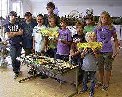 Modellbahn-Nachwuchs in Aktion und als stolze Besitzer von LKWs oder Waggons mit Ladegüter. Ferienprogramm 2009Am 4.September 2009 war "Fahren" angesagt. Mit einem recht kleinen Arrangement waren wir mit 12 Kinder an der Leistungsgrenze, denn 2 Kinder teilten sich eine Betriebsstelle. Zuerst wurde erklärt, warum es einen Fahrplan gibt, warum unsere Uhren schneller laufen, wie das mit dem Fahrplan funktioniert etc. Die Kleinen waren recht schnell von Begriff und hatten keinerlei Probleme. Im Gegenteil, alle hatten großen Spaß: die Kinder und wir auch! Nur Fotos wurden an dem Tag leider keine gemacht...Ferienprogramm 2008Auch in diesem Jahr boten wir die Möglichkeit, für Haager Kinder an einer Modellbahn zu basteln. Nachdem sich mehr Kinder gemeldet hatten, als im Kurs eigentlich Platz hatten, gab es eine Dreiteilung: