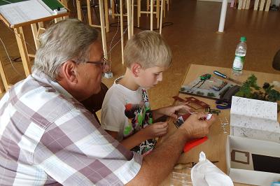 Wie in den vergangenen Jahren hatten wir Sperrholzplatten mit Gleisen vorbereitet, die wir die Kinder landschaftlich ausgestalten ließen. Sie waren alle mit Begeisterung dabei.